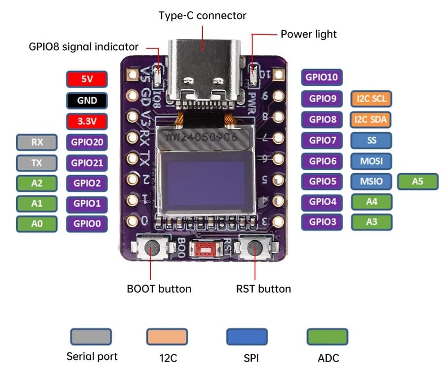 Parmi les autres fonctionnalités, on trouve une LED intégrée sur GPIO8, la communication UART sur GPIO21 et GPIO20, une seconde interface I2C sur GPIO8 et GPIO9, le SPI, un convertisseur analogique-numérique (GPIO0 à GPIO5) et le bouton BOOT sur GPIO9 pour le démarrage ou la réinitialisation. Cette carte est idéale pour les projets IoT qui nécessitent flexibilité et format compact.