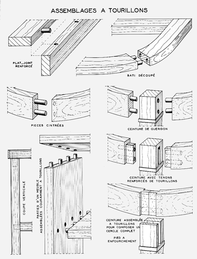 Le tourillonnage estutilise pour des elements demontables, comme pour des elements fixes (sieges, cadres, armoires, corps de meubles).