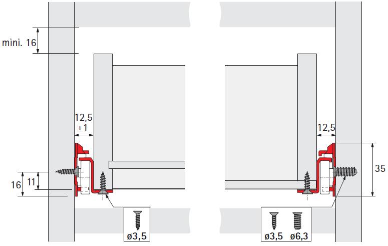 Montage avec vis à bois ∅3.5mm ou Eurovis ∅6.3mm.