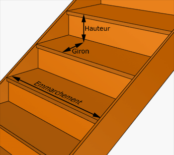 Mesure du pas de foulé moins le nez de marche. Le giron se calcul sur la ligne de foulée. Toutes les marches de l'escalier ont le même giron.