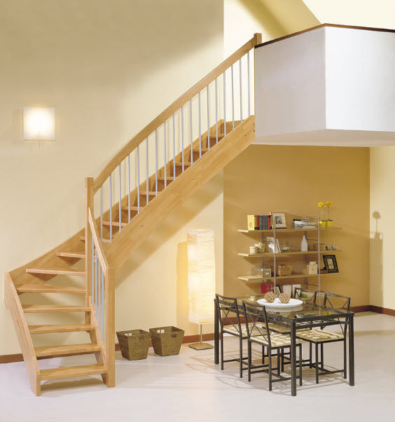 Escalier avec un seul virage, en bas, ou en haut. En général 90° mais souvent les angles relevé sur les murs diffère de la normalité.(sur 1m de longueur une différence de 1° provoquerait une erreur de 18 mm).