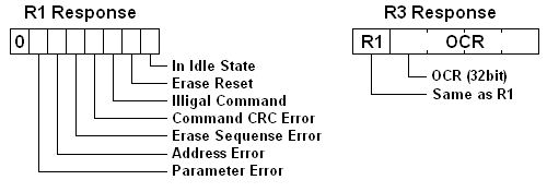 Il existe quelques formats de réponse de commande, R1, R2, R3 et R7, dépend de l'index de commande.Un byte de réponse, R1, est retourné pour la plupart des commandes.
