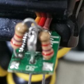| Remplacement du potentiomètre par deux résistances, soit la moitié de la valeur du potentiomètre Ici 2,7kΩ | Couper la patte qui dépasse de l'engrenage |