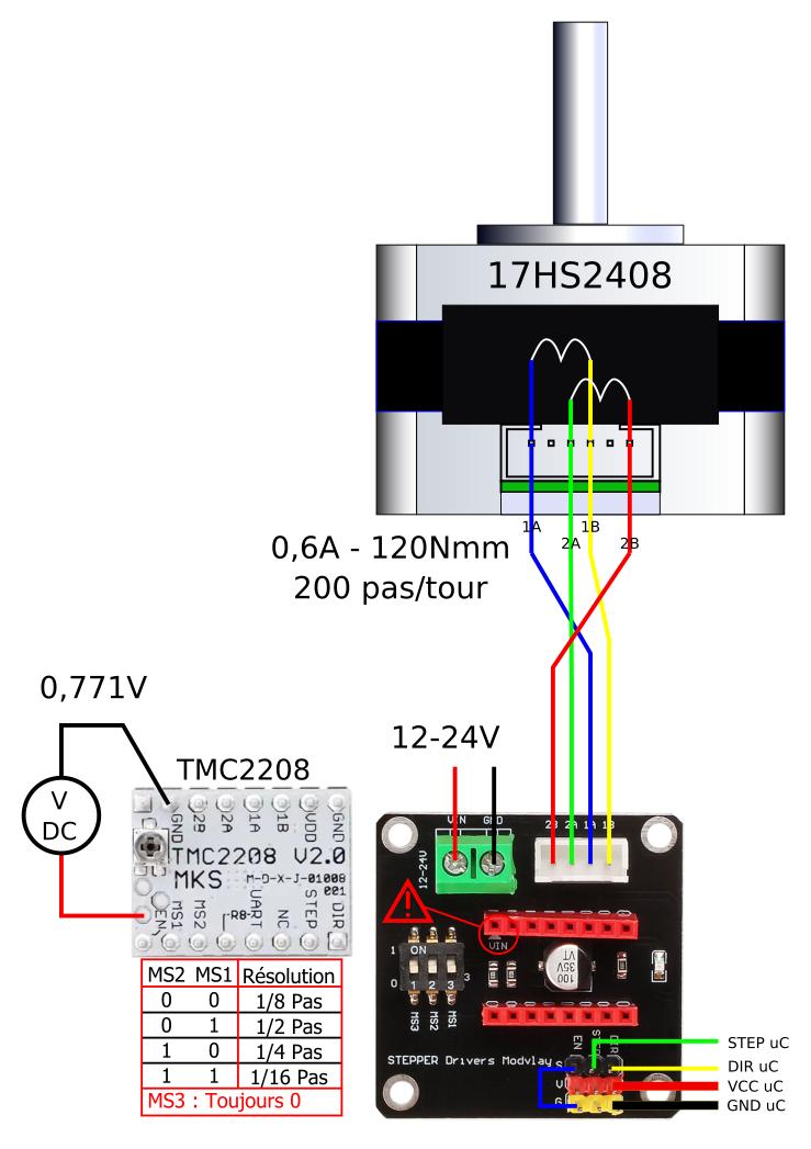 Bien que le moteur pas à pas que nous utiliserons ici 17HS2408 est soit conçu pour 0,6A, nous ne devons jamais le régler à sa capacité de courant maximale.