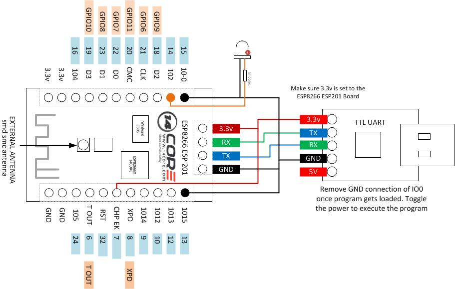 - TXD/GPIO1 et RXD GPIO3 sont utilisés à des fins d'interfaçage,